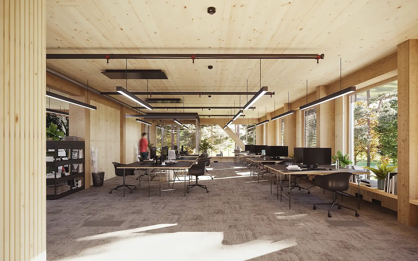 Office spaces ideally adapt to employees' daily routines and deliberately encourage creative collaboration through dedicated workshops and team areas, as well as digital collaboration tools (such as video walls, surface nodes, screens). Intelligent networked building infrastructure (e.g. sensors, smart meters) also allows cost-effective and sustainable management of the basic functions of the building (e.g. use, energy consumption). That area flexibility allows companies to cut back on office spaces.